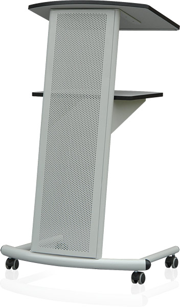 Profesjonalna, stabilna mównica o nowoczesnym wzornictwie, wykonana z najwyższej jakości materiałów. Konstrukcja ze stali w kolorze popielatym (połysk) z grafitowymi wykończeniami. Przód mównicy pochylony o 10° od pionu. Górny i dolny blat wykonany z płyty meblowej. Dodatkowo górny blat posiada specjalny próg, zabezpieczający przed zsunięciem się kartek. Podstawa jezdna wyposażona w 4 kółka z systemem blokowania, ułatwiające przemieszczanie.